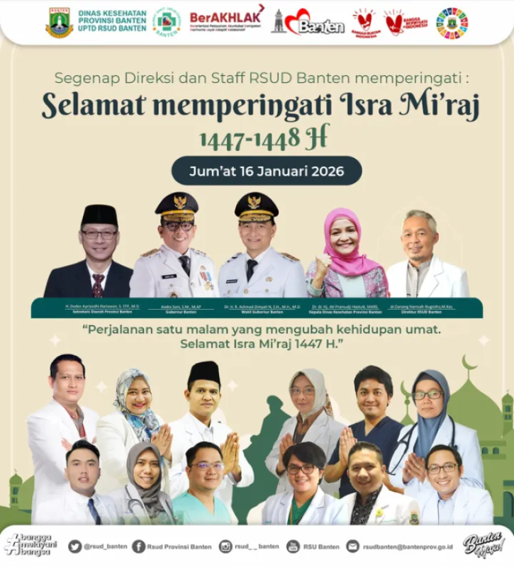 Sumber Gambar : LBRSegenap Direksi dan Staff RSUD Banten Mengucapkan Selamat memperingati Isra Mi'raj 1447 H. Marilah kita renungkan makna Isra Mi'raj untuk terus memperbaiki kualitas ibadah kita. Kita Bisa, Yakin Bisa, Pasti Bisa ! Gunakan MOBILE JKN untuk Pasien BPJS sebelum kunjungan Poli Rawat Jalan (maksimal H-1) atau e-RESERVASI RSUD BANTEN untuk Pasien Umum.