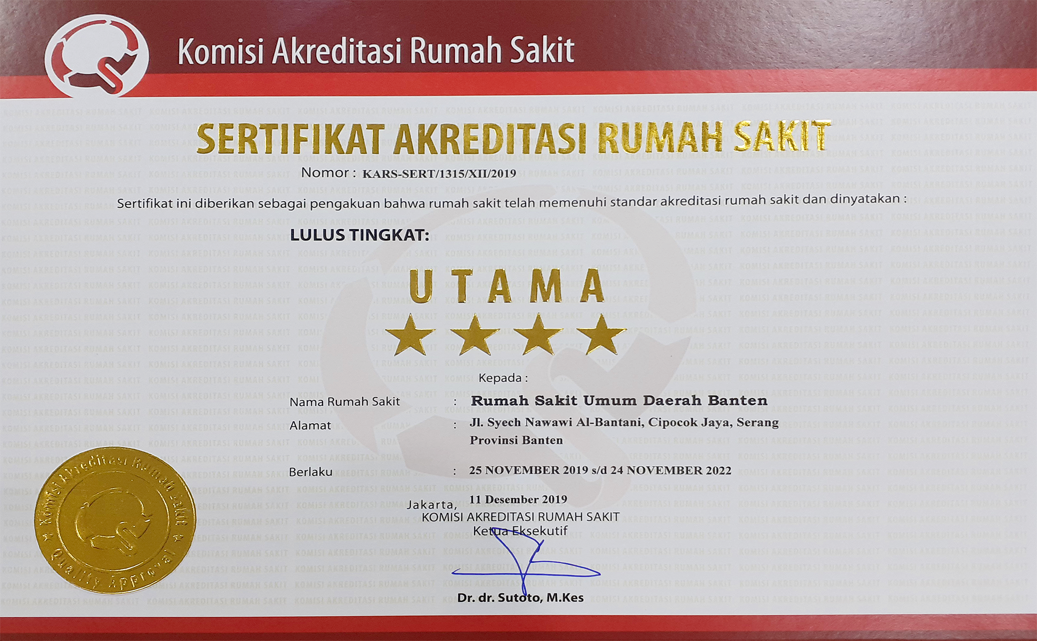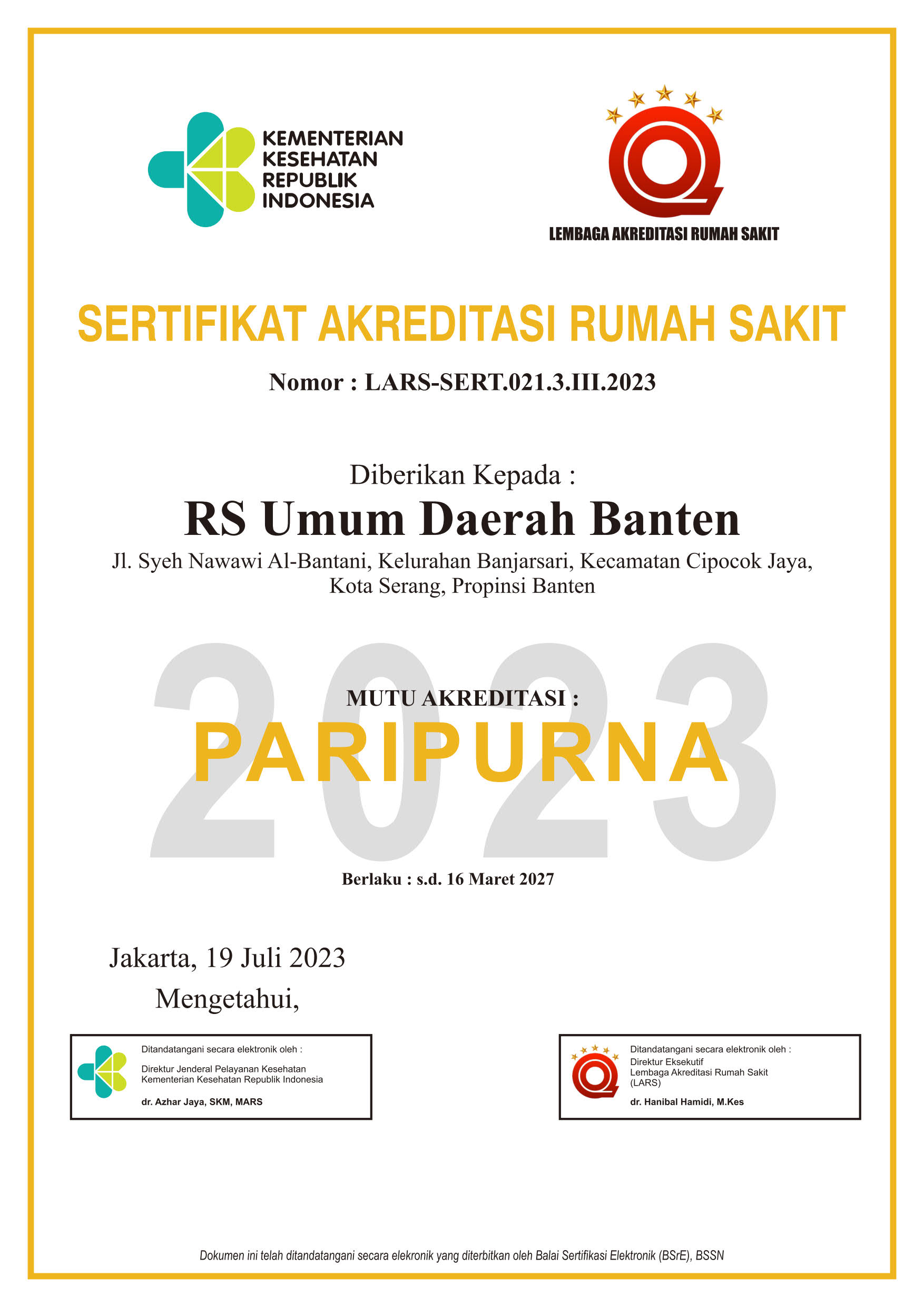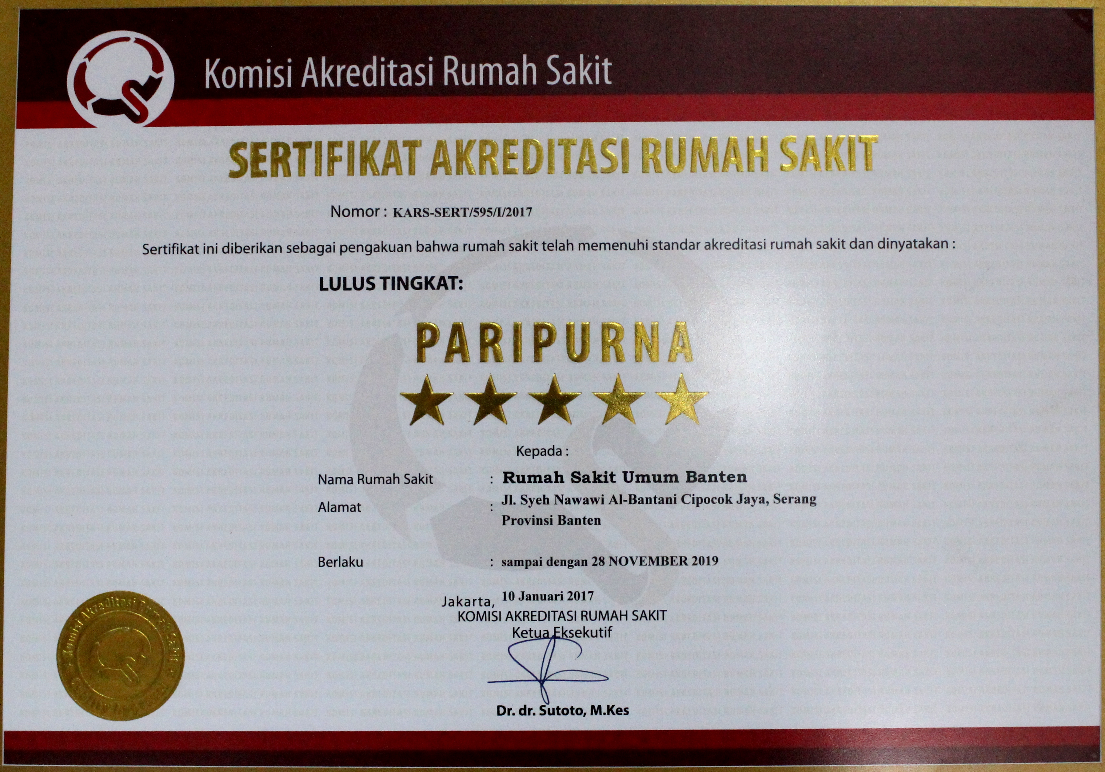 13 Sep 2025 Sertifikat Akreditasi RSUD Banten Oleh Denny Priatna, S.Kom. Riwayat Akreditasi 9 View Sertifikat Akreditasi 2023 Sertifikat Akreditasi 2019 Sertifikat Akreditasi 2017 Share this Post
